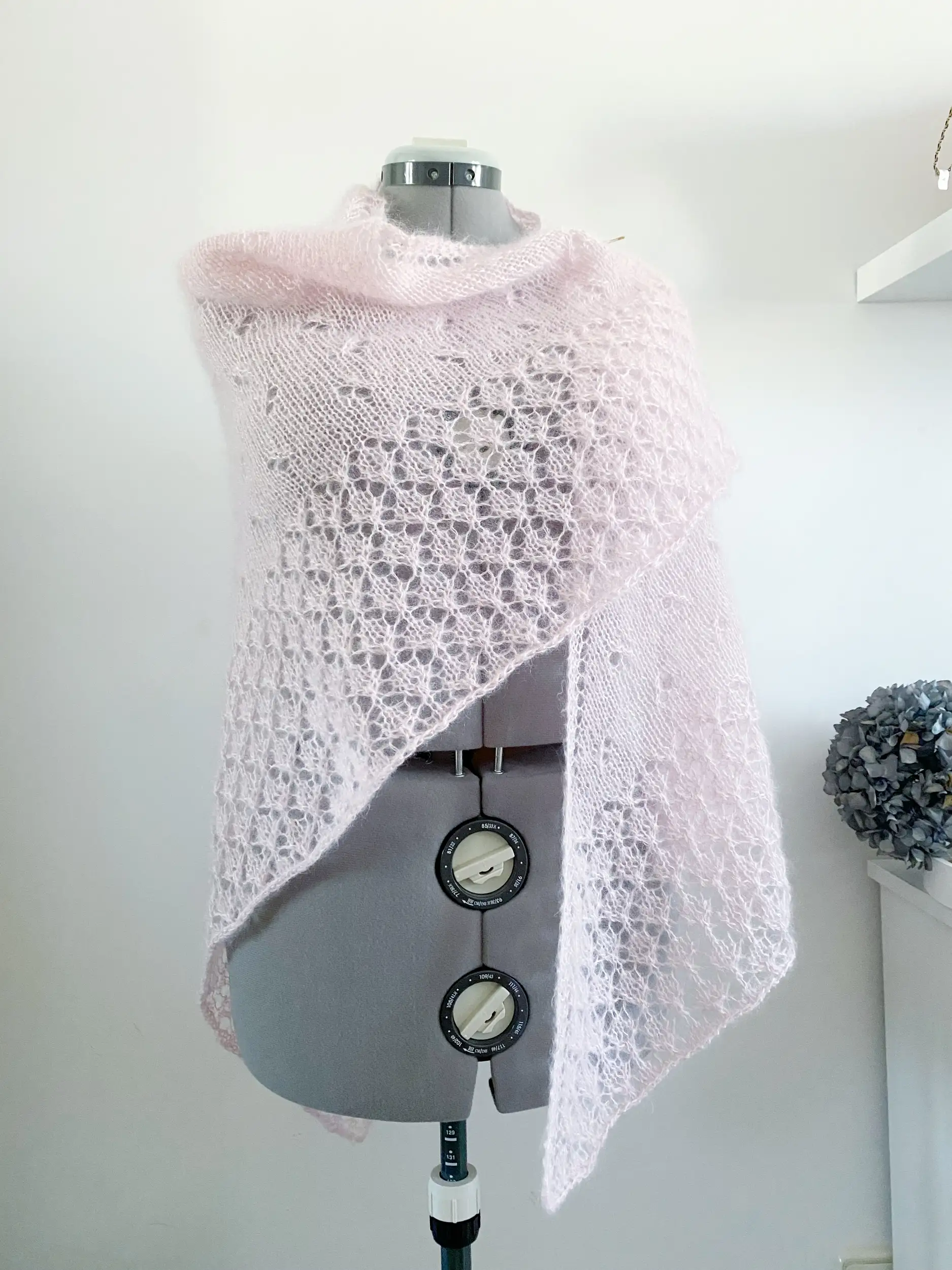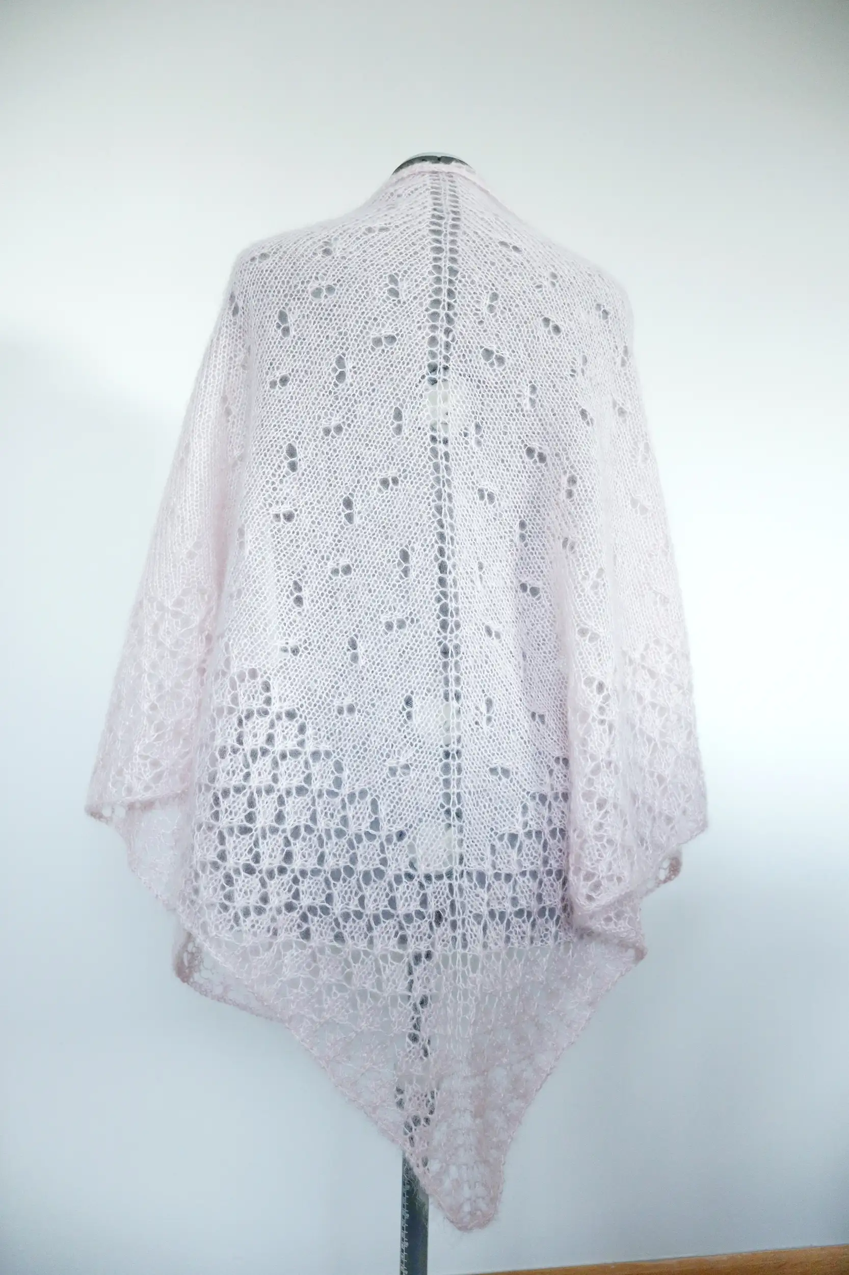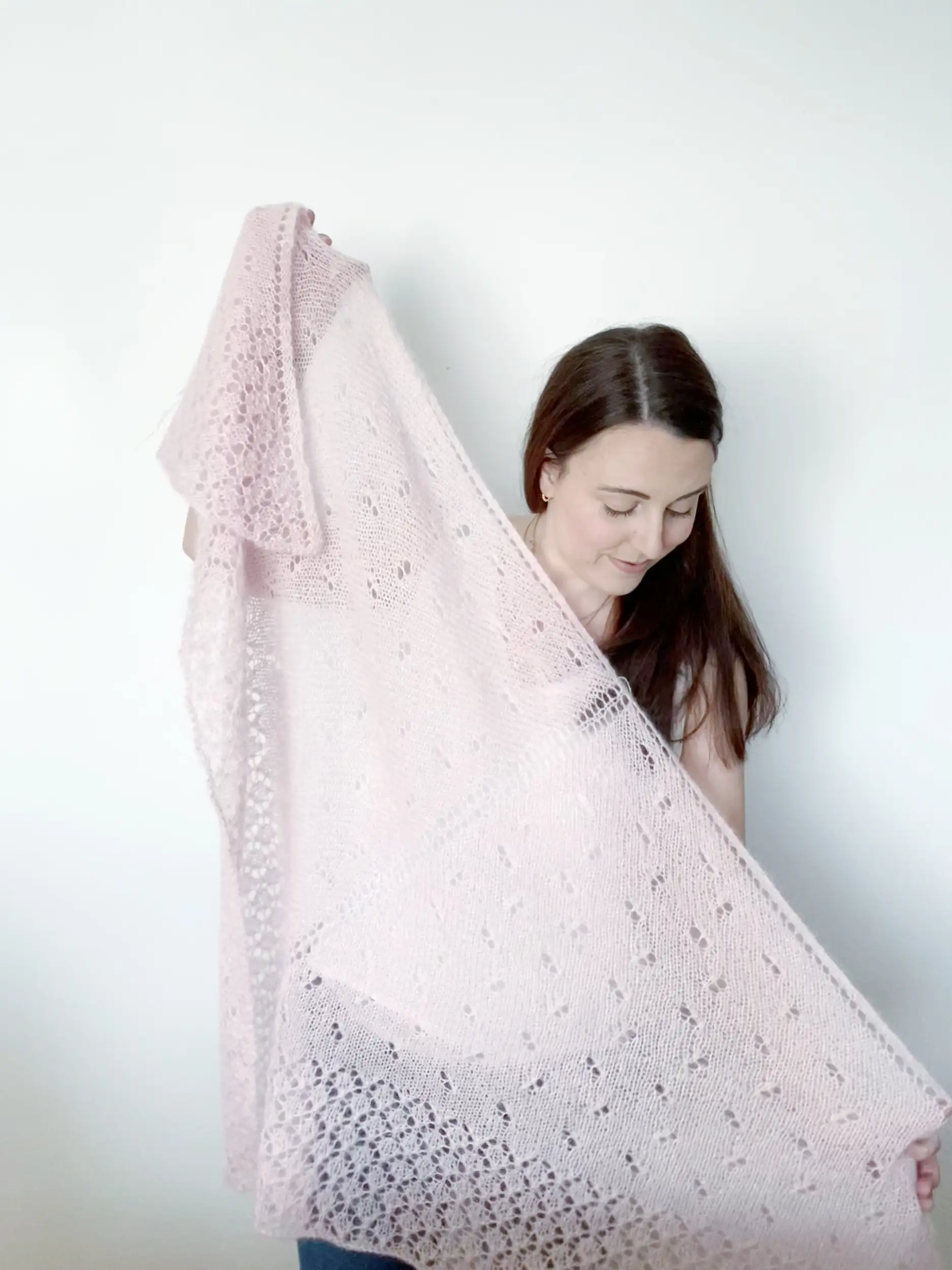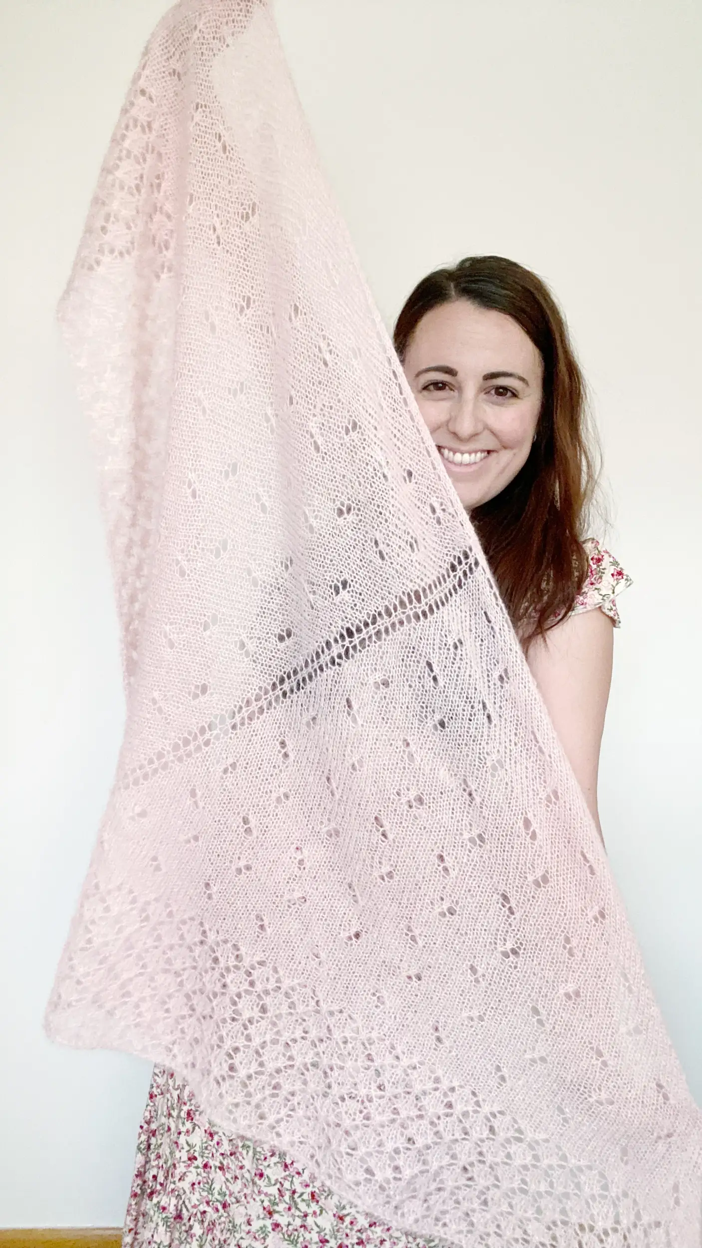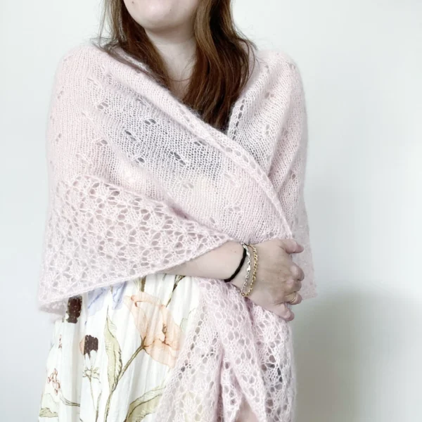 El chal EMBAT es un chal muy ligero y suave con un cuerpo de punto jersey con calados, además de un borde de encaje que aporta un detalle único al patrón. Tiene forma triangular, con aumentos en los extremos y en el centro para crear esa forma de pico.