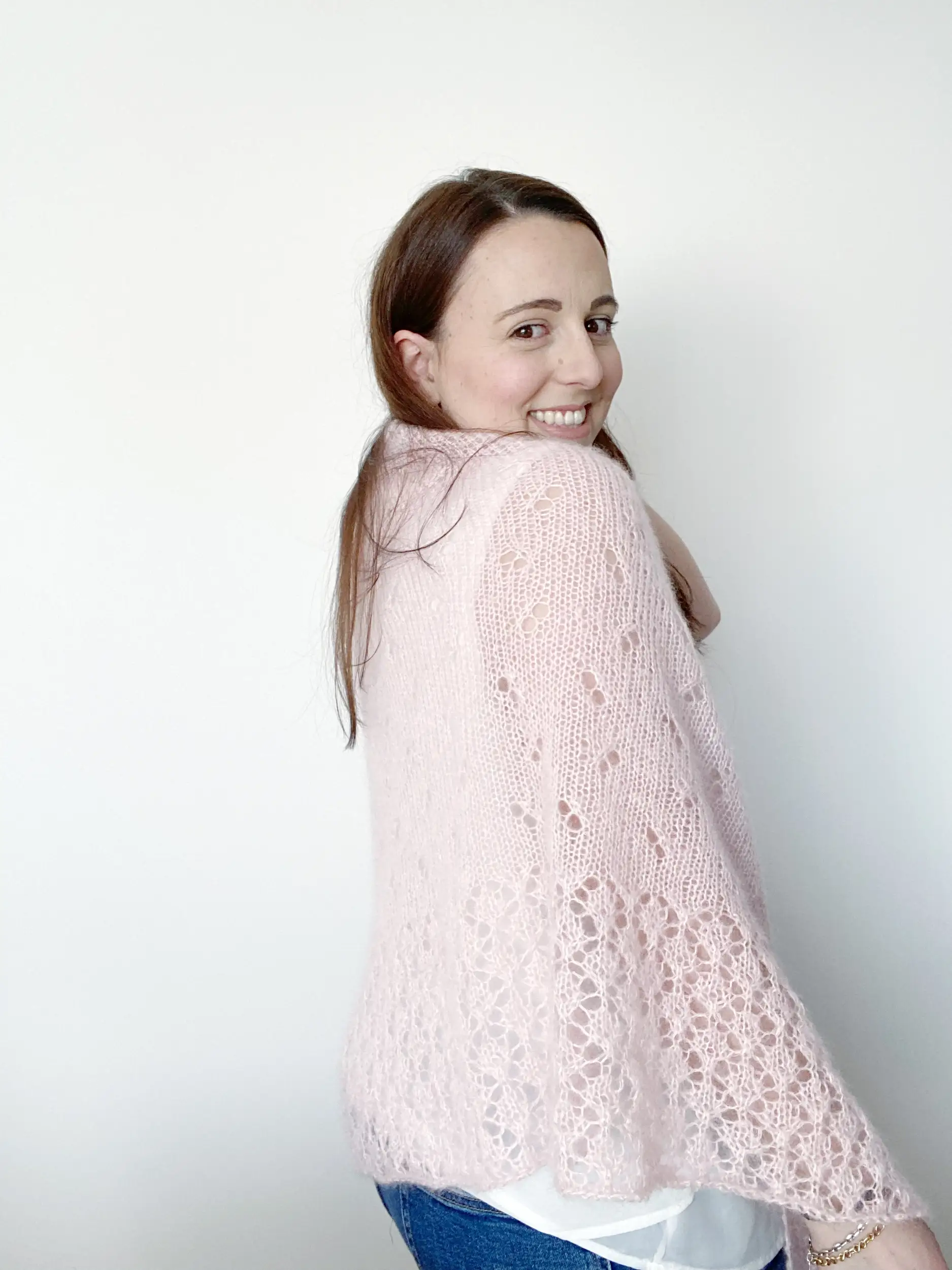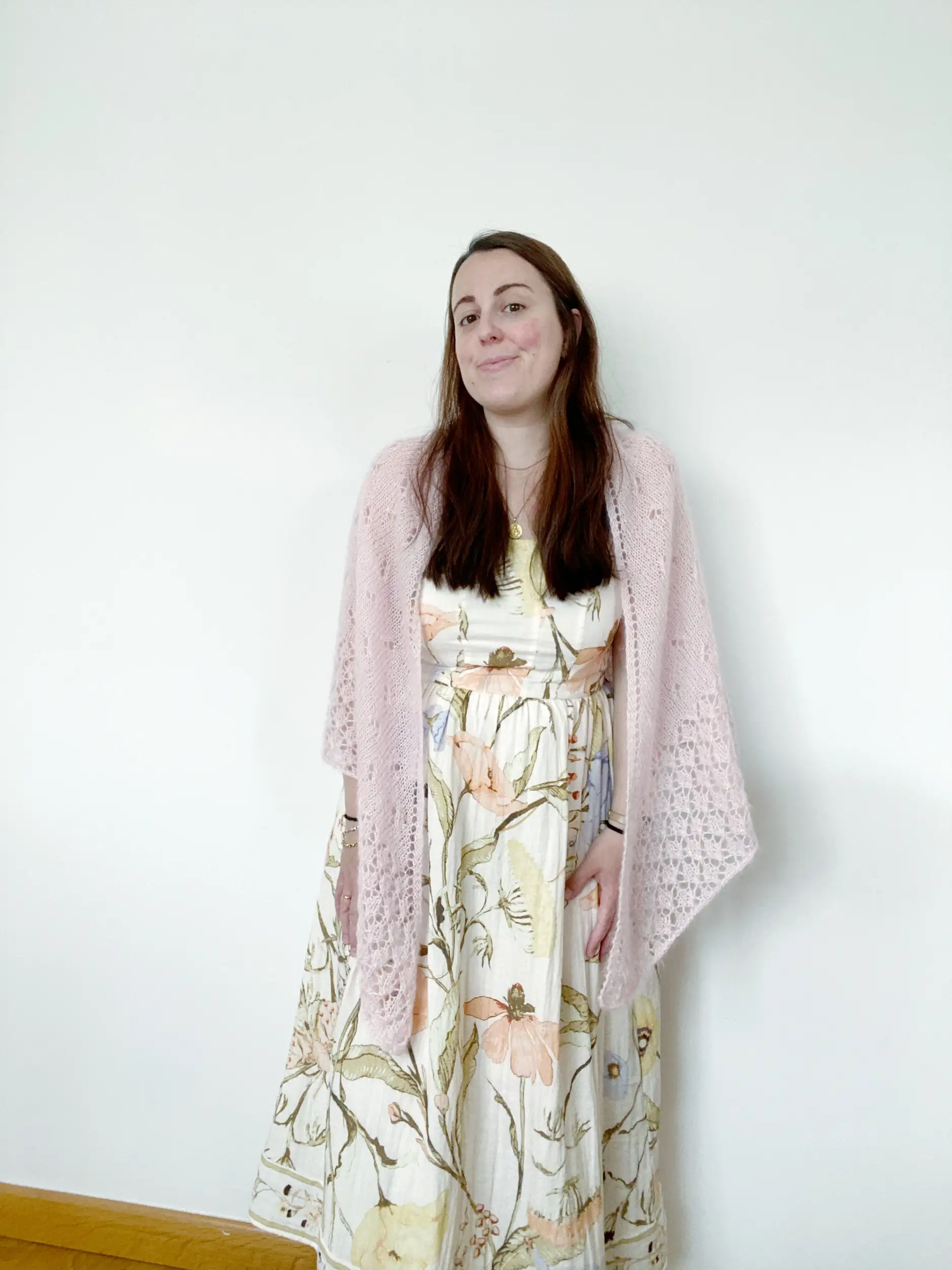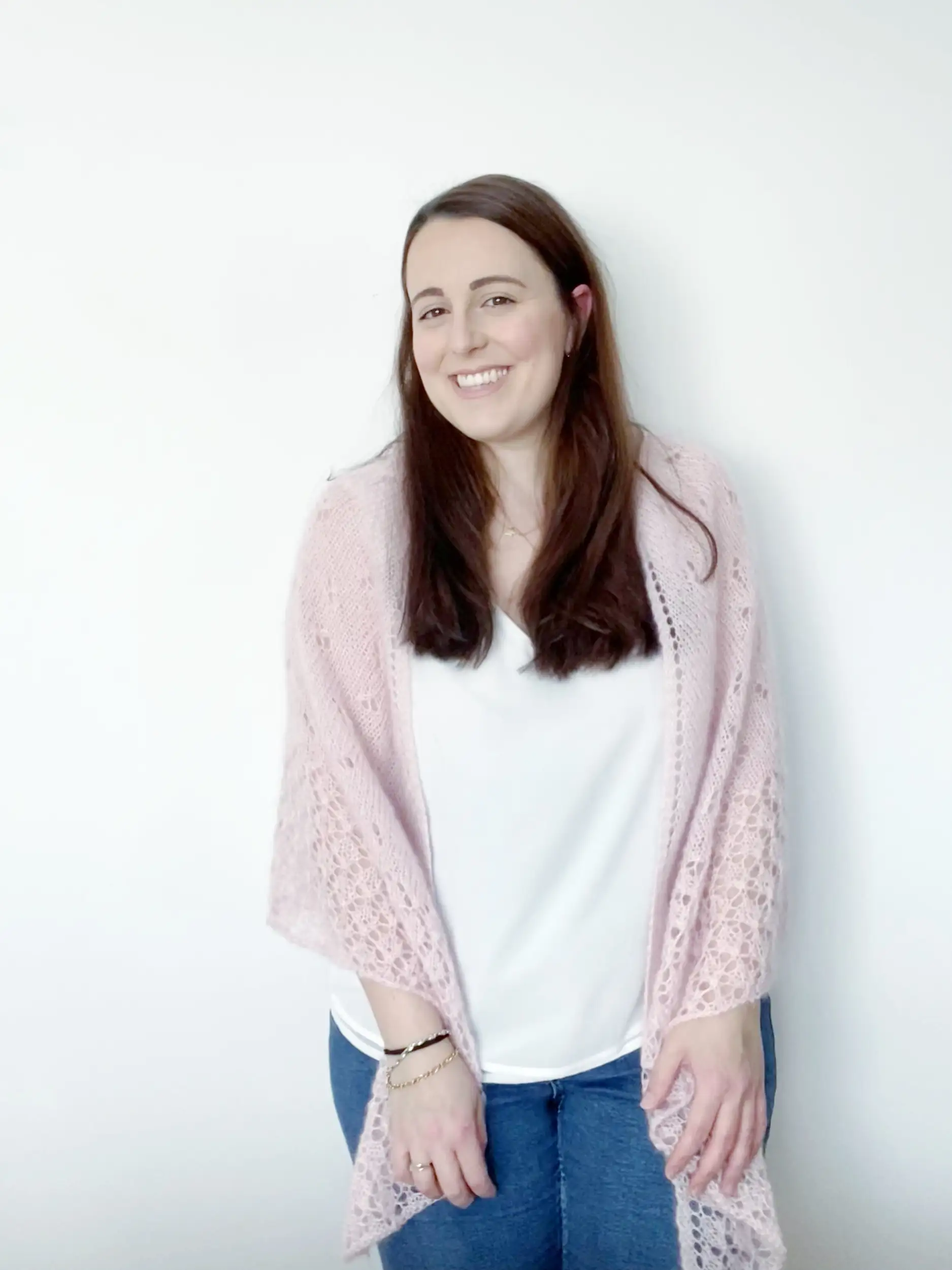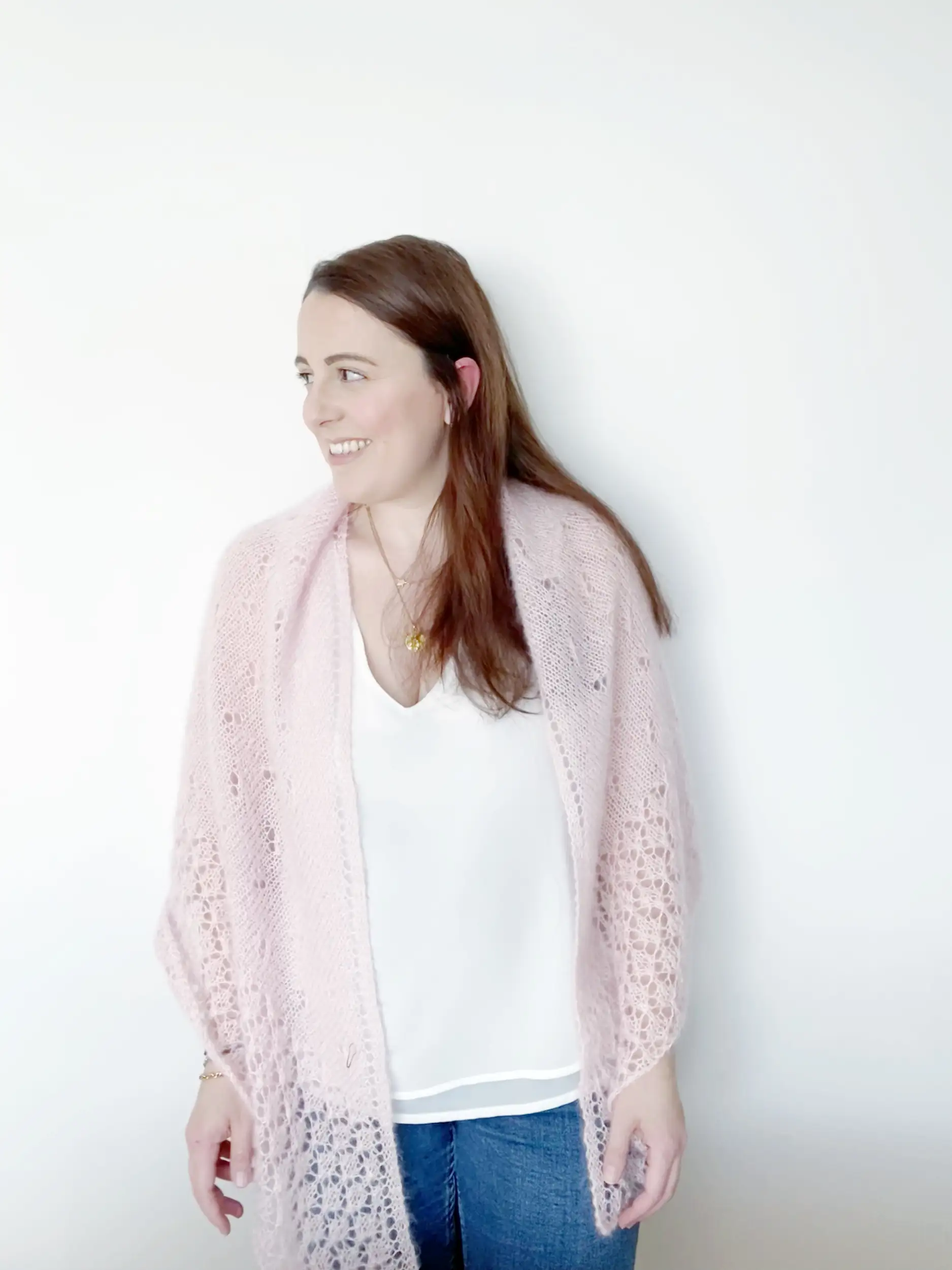 El chal EMBAT es un chal muy ligero y suave con un cuerpo de punto jersey con calados, además de un borde de encaje que aporta un detalle único al patrón. Tiene forma triangular, con aumentos en los extremos y en el centro para crear esa forma de pico.